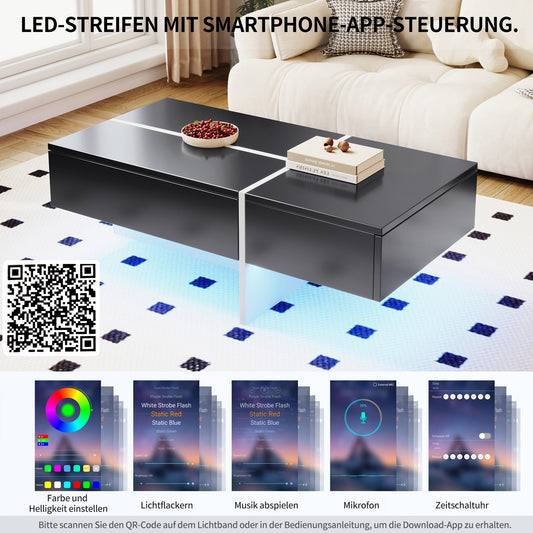 Table basse brillante, structure en imitation marbre blanc et table assortie en noir, meuble de salon, 100*50*34,5 cm, avec système d'éclairage LED contrôlé par application
